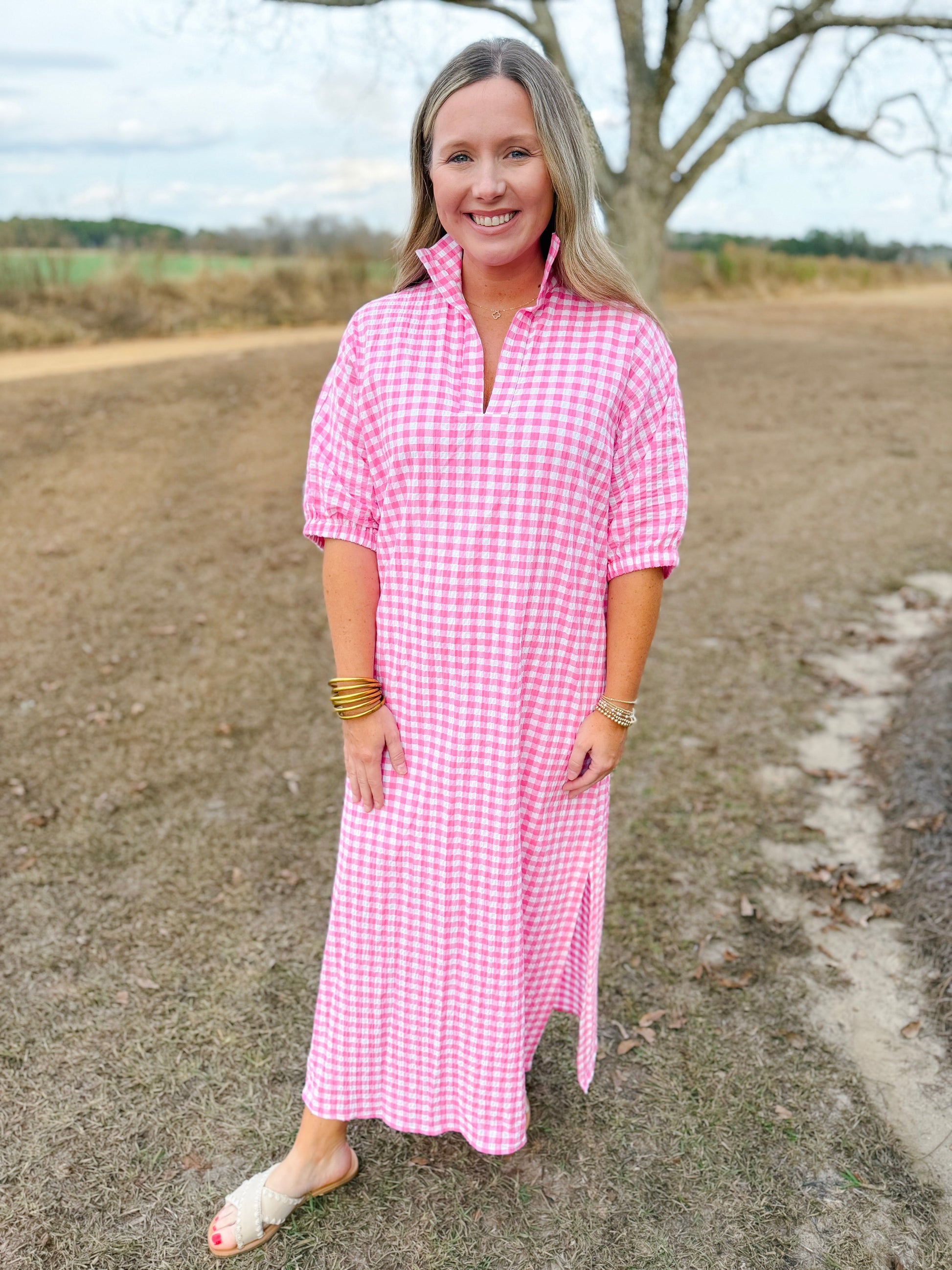 Plus Spring Blakely Midi Dress in Pink Seersucker Gingham